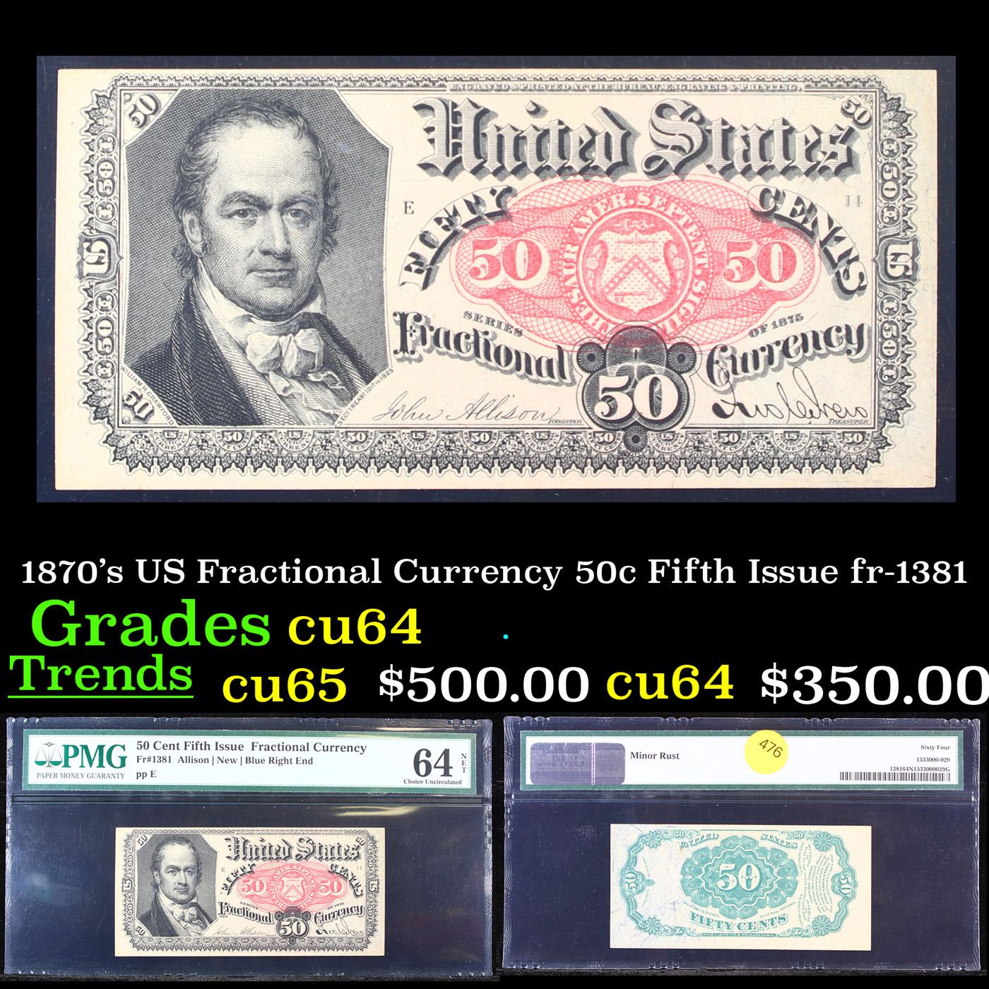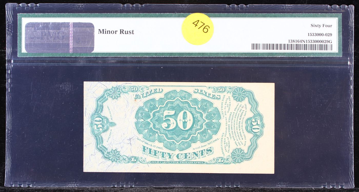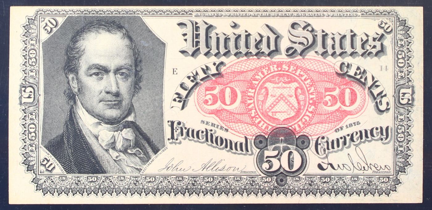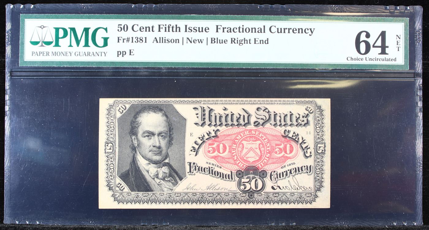 1870's US Fractional Currency 50c Fifth Issue fr-1381 Graded cu64 By PMG. Fractional or postage currency has a rich history. At the beginning of the Civil War people starting hoarding coins for their precious metal content. Coins became difficult to find because of the hoarding. People started to try to use stamps instead of coins as a means of commerce. The government decided to help ease the hoarding issue by issuing “paper coins” also known as postage currency or fractional currency. Fractional currency was first issued on August 21, 1862 and they were last issued on February 15, 1876. Three cents, five cents, ten cents, twenty-five cents, and fifty cents notes were all issued. Fractional currency is physically smaller than other United States money. It also does not have a serial number.