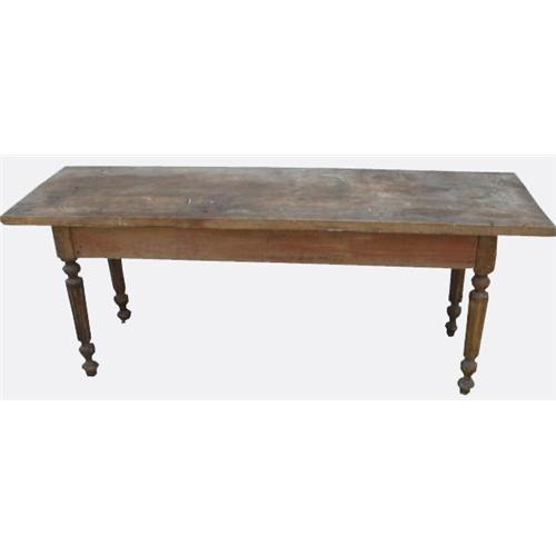 This is an old rectangular table from the 1870's. It is solid and the wood is unfinished. The top is made from 1 piece of walnut and is 1 5/8" thick. There are pine stretchers on the sides, walnut legs and square nails used for construction.