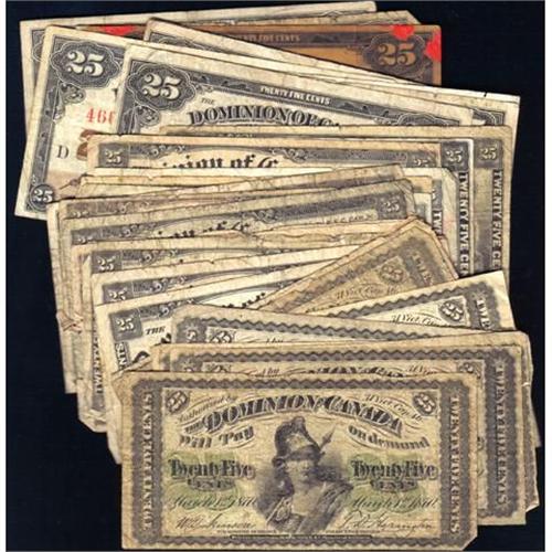 1870 Twenty-Five Cents, Series B, DC-1b, eight notes. Plus 1870 Twenty-Five Cents, Plain DC-1c, five notes. Plus 1900 Twenty-Five Cents, Courtney, DC-15a four notes, 1900 Twenty-Five Cents, Boville, DC-15b nine notes and 1900 Twenty-Five Cents, Saunders, DC-15c one note. Plus 1923 Twenty-Five Cents Hyndman-Saunders Authorized, DC-24a two notes, 1923 Twenty-Five Cents Hyndman-Saunders No Authorized DC-24b one note, 1923 Twenty-Five Cents McCavour-Saunders, DC-24c five notes and 1923 Twenty-Five Cents Campbell-Clark, DC-24d one note. A total of thirty-six notes, mostly Good and better, some of them with problems