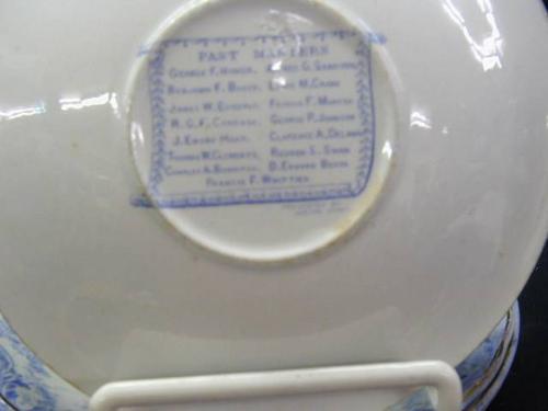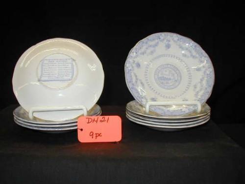 1870'S, MASONIC, ENGLISH, BLUE TRANSFER SAUCERS inBETH HORON LODGE BROOKLINE MASS. INST. SEPT 1870in, BACK OF SAUCER LISTS PAST MASTERS, PRESENTED BY JEROME JONES 9 PCS. W/RIM FLAKES