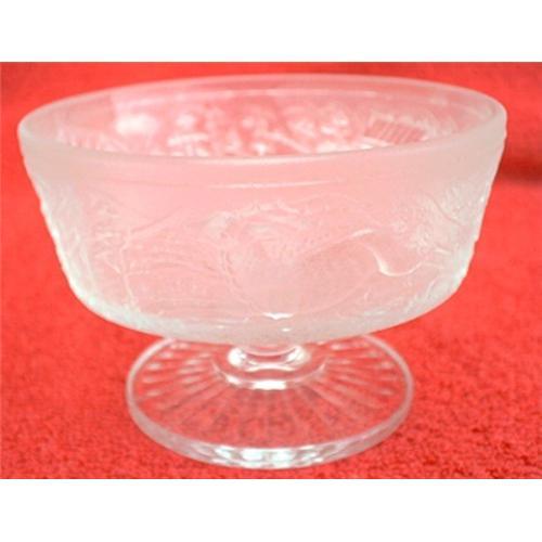 This is an Early American Pattern Glass footed sauce in the Westward Ho pattern that is 134 years old. It is highly embossed and detailed with trees, a deer, a cabin and a buffalo. It was made by Gillinder and Co in the 1870s and has a frosted bowl and clear footed base in non-flint glass. I have a total of three of these footed sauces at $95.00 each. They are not quite 3" tall and in mint condition with no chips or cracks. I bought this from a person I have been buying alot of pieces from in the last few months. All the items have been stored since the 1940s when his grandmother closed her antique shop in NJ and moved to Florida. It had never been unpacked or rewrapped until he brought it in in the original 1940s newspaper. Everything I have bought has been from the mid 1800s to early 1900s. Most of it mid to late 1800s. There is absolutely no doubt about this rare and wonderful piece.