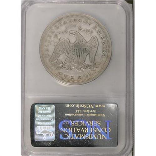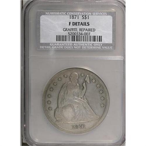 <B>1871 $1 --Graffiti, Repaired--NCS. Fine Details.</B></I> NGC Census: (0/0). PCGS Population (0/0). Mintage: 1,074,760. (#6966)<BR><BR><B>Coin Engraver:</B> Christian Gobrecht<BR><BR><b>Shipping:</b> Coins & Currency (<a target="_blank" href="http://www.heritageauctions.com/common/shipping.php">view shipping information</a>)