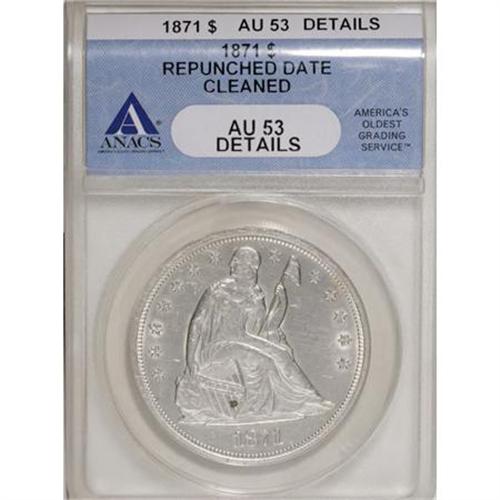 <B>1871 $1 --Cleaned, Repunched Date--ANACS. AU53 Details.</B></I> NGC Census: (26/238). PCGS Population (35/234). Mintage: 1,074,760. Numismedia Wsl. Price for NGC/PCGS coin in AU53: $600. (#6966)<BR><BR><B>Coin Engraver:</B> Christian Gobrecht<BR><BR><b>Shipping:</b> Coins & Currency (<a target="_blank" href="http://www.heritageauctions.com/common/shipping.php">view shipping information</a>)