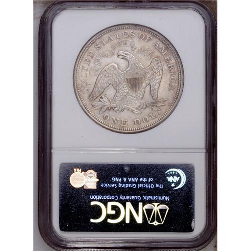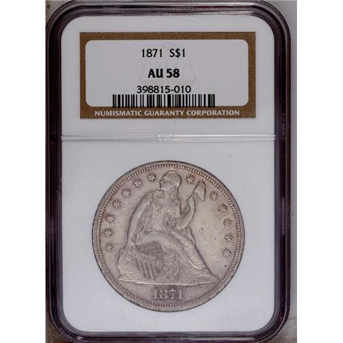 <B>1871<$1> AU58 NGC.</B></I> Satin luster is essentially complete, and the light chestnut-gold toning is attractive. The right obverse field is typically abraded. The 1871 is a high mintage issue, but most pieces were exported. Near-mint and better examples are very scarce. <BR><BR><B>Important notice:</B> Heritage usually auctions material at the rate of 200-250 lots per hour. On some occasions eBay Live bid software or the Internet may not be able to keep up with the pace of the auction. We recommend placing a realistic absentee bid now as insurance to avoid disappointment. Occasionally the auctioneer may eliminate or reject an eBay Live bid, and the auctioneer may also reopen a lot after the close of the eBay live bidding (usually because we missed an audience bid), and may reject your bid even if it shows you as the winning bidder. By bidding via eBay Live, you agree that Heritage may award the lot to another bidder at its sole discretion under the circumstances described above or any other reasonable circumstances. Since eBay bids are not shown to us until we open the lot on the floor, we treat those bids just like floor bids. In most cases the floor responds before the eBay bid is presented to us, due to Internet lag time, so for consistency we have made it a policy that floor bids are always considered first over tie eBay live bids. Also please note that all Heritage lots purchased through eBay Live carry a 20% Buyer's Premium. Please make sure you read the Terms and Conditions before you bid. This lot is being auctioned in conjunction with a live floor auction by Heritage Galleries & Auctioneers. All final auction and invoice information will be supplied by Heritage Galleries & Auctioneers, and all other information should be considered preliminary. Lot:2197 <BR><BR><B>Winning Notification and Billing:</B> After the FINAL session in this auction is complete, Heritage will send e-mail and snail mail invoices. This process normally takes several days. All final auction and invoice information will be supplied by Heritage Galleries & Auctioneers, and all other information should be considered preliminary. <BR><BR>This auction will be conducted on a live auction floor and over the Internet through eBay Live. If you choose to place an absentee bid, please take a moment to <font color='#0000ff'><u><a href='http://pages.ebay.com/liveauctions/help/before/laabsentee.html'>learn how eBay Live absentee bidding works</a></u></font><font color='#000000'>