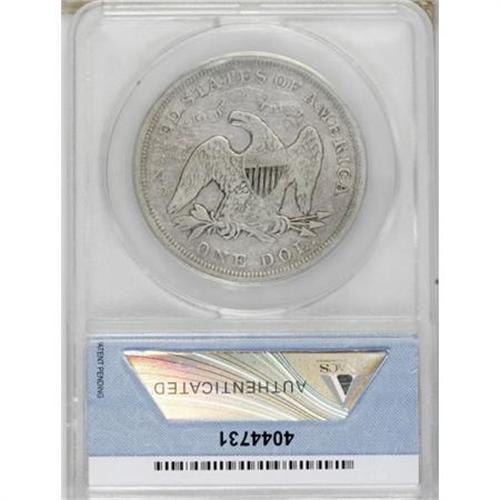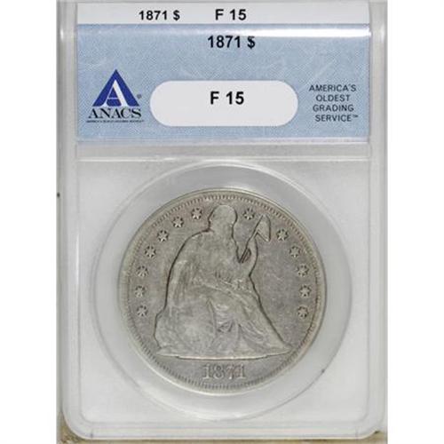 <B>1871 $1 F15 ANACS.</B></I> . NGC Census: (2/391). PCGS Population (7/504). Mintage: 1,074,760. Numismedia Wsl. Price for NGC/PCGS coin in F15: $254. (#6966)<BR><BR><B>Coin Engraver:</B> Christian Gobrecht<BR><BR><b>Shipping:</b> Coins & Currency (<a target="_blank" href="http://www.heritageauctions.com/common/shipping.php">view shipping information</a>)