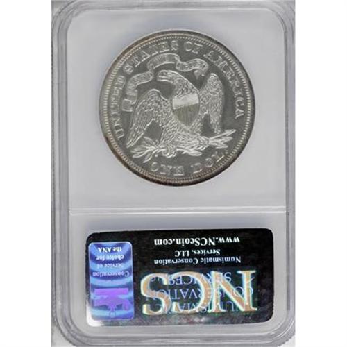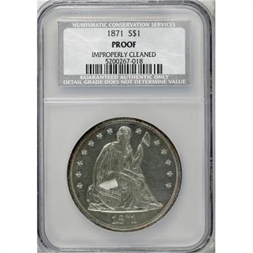 <B>1871 $1 --Improperly Cleaned--NCS. Proof.</B></I> The surfaces of this late-date Seated dollar proof show no trace of friction, though the minimally toned surfaces show an unusual overall effect and a number of hairlines in the fields. Scattered contact is noted on the obverse.<BR><BR><B>Coin Engraver:</B> Christian Gobrecht<BR><BR><b>Shipping:</b> Coins & Currency (<a target="_blank" href="http://www.heritageauctions.com/common/shipping.php">view shipping information</a>)