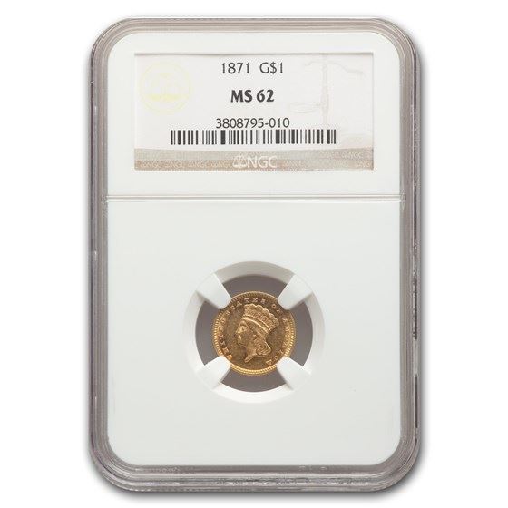 One piece 1871 $1 Indian Head Gold MS-62 NGC
