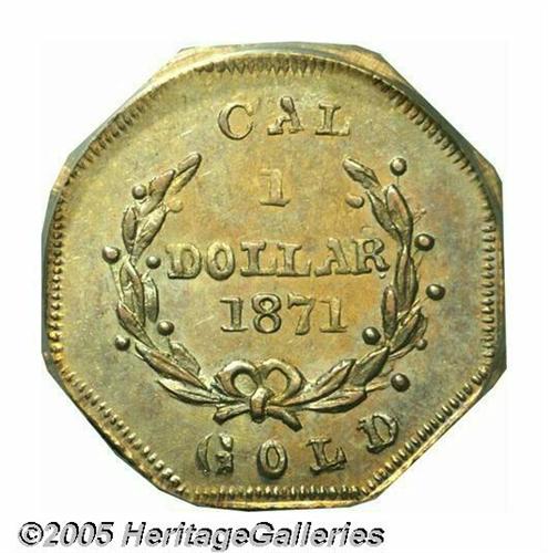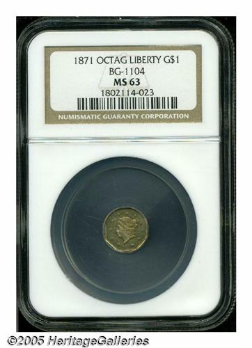 <B>1871<$1> Liberty Octagonal 1 Dollar, BG-1104, High R.4, MS63 NGC.</B></I> A rare Period Two one-dollar piece that has a reverse design unique to this variety with CAL at the top of that side and GOLD below. Generally not found in higher grades. This example has orange color blended with blue and iridescent toning.