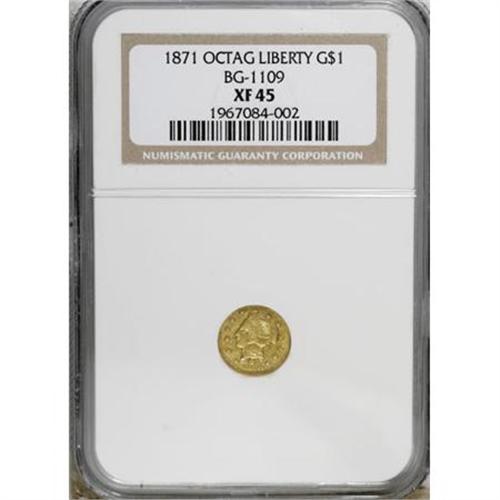 <B>1871 $1 Liberty Octagonal 1 Dollar, BG-1109, Low R.4, XF45 NGC.</B></I> NGC Census: (1/3). PCGS Population (2/83). (#10920)<BR><BR><b>Shipping:</b> Coins & Currency (<a target="_blank" href="http://www.heritageauctions.com/common/shipping.php">view shipping information</a>)