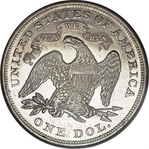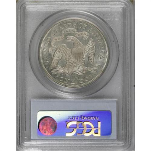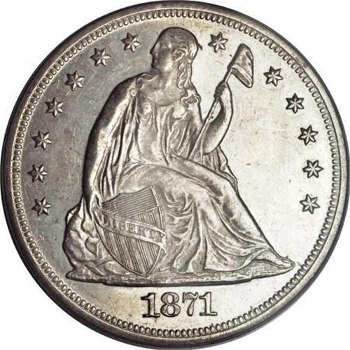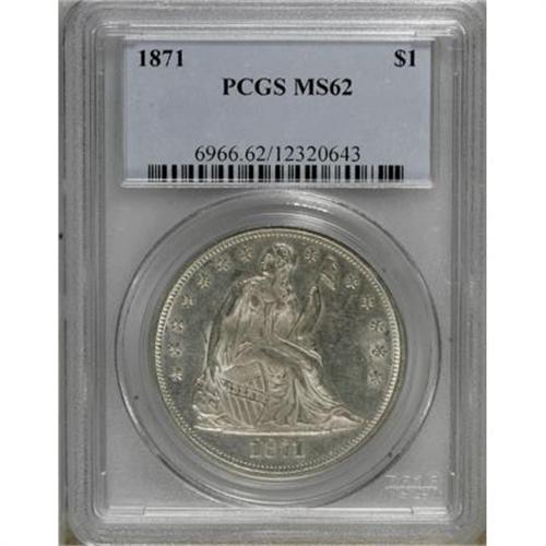 <B>1871 $1 MS62 PCGS.</B></I> This is a fairly common Seated dollar within the context of the series, but for the grade this piece offers much eye appeal, despite the small field marks that preclude a higher grade. Both sides are lustrous, silver-white with just a hint of gold, and the strike is generous if a trifle short of full. A nice type coin.<BR><BR><B>Coin Engraver:</B> Christian Gobrecht<BR><BR><b>Shipping:</b> Coins & Currency (<a target="_blank" href="http://www.heritageauctions.com/common/shipping.php">view shipping information</a>)