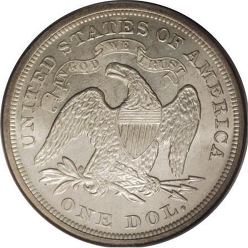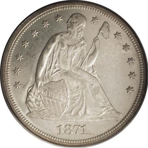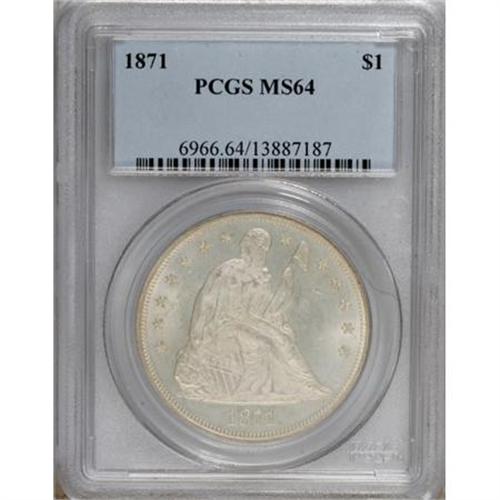 <B>1871 $1 MS64 PCGS.</B></I> The 1871 and the 1872 are type coins in the With Motto series, primarily because of their relatively large mintages. However, even though more than a million Seated dollars were struck in 1871 only 67 pieces have been certified by PCGS and NGC in MS64. This is a lovely coin with cartwheel luster and the semi-prooflike fields that are often seen on Seated dollars. Fully struck in all areas. The surfaces generally present as brilliant but there is just the slightest hint of color present when closely examined. <BR><BR><b>Shipping:</b> Coins & Currency (<a target="_blank" href="http://www.heritageauctions.com/common/shipping.php">view shipping information</a>)