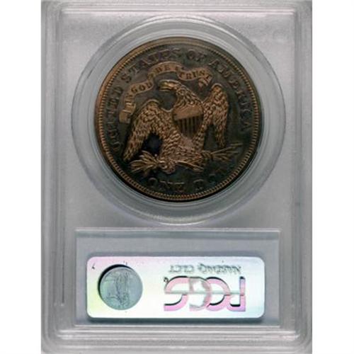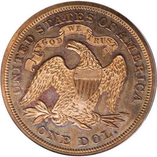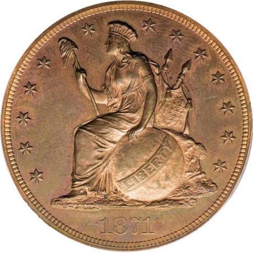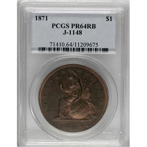 <B>1871 $1 One Dollar, Judd-1148, Pollock-1290, R.6-7, PR64 Red and Brown PCGS.</B></I> Longacre's design features Liberty seated next to a globe with a feathered bonnet, flags behind, and a staff in her hand with a cap at the end. There are 13 stars around the periphery and 22 stars on the flag. The regular Seated Liberty reverse die is used. Struck in copper with a plain edge. This razor-sharp near-Gem has reflective fields and luminous peach and ruby-red coloration. A few tiny carbon flecks approach the devices but do not substantially reduce the charm of this lovely and rare specimen. Population: 2 in 64 Red and Brown, 3 finer (7/07). <BR><BR><BR><b>Shipping:</b> Coins & Currency (<a target="_blank" href="http://www.heritageauctions.com/common/shipping.php">view shipping information</a>)