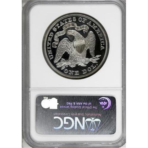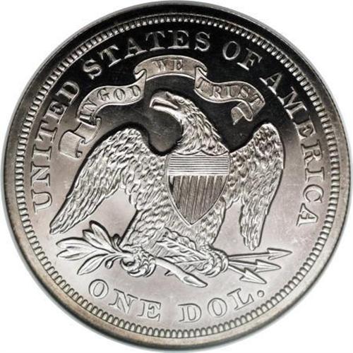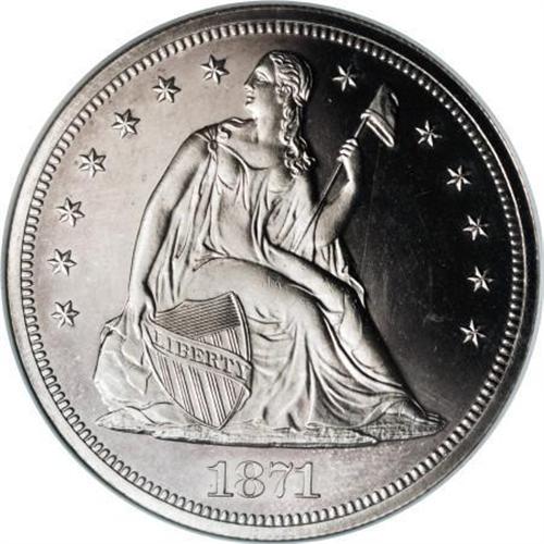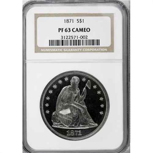 <B>1871 $1 PR63 Cameo NGC.</B></I> Both sides are untoned and display a strong contrast between the fields and well-defined devices. The contrast on the reverse is especially dramatic and the overall appeal is significantly greater than on other PR63 examples. A bit of haze is noted near the eagle's head on the reverse and a small patch of hairlines can be seen to the right of the date on the obverse. Population: 7 in 63 Cameo, 9 finer (11/07).<BR><BR><b>Shipping:</b> Coins & Currency (<a target="_blank" href="http://www.heritageauctions.com/common/shipping.php">view shipping information</a>)