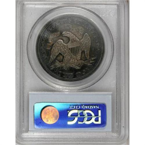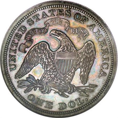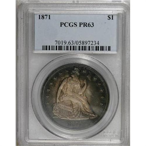 <B>1871 $1 PR63 PCGS.</B></I> Deep autumn-brown and forest-green envelops this exactingly struck and attractive Seated dollar. Smooth for the grade apart from a thin mark above ONE. More than 1 million business strikes were produced, but so many were exported that today, proofs are more available than Mint State examples. Only 960 proofs were struck.<BR><BR><B>Coin Engraver:</B> Christian Gobrecht<BR><BR><b>Shipping:</b> Coins & Currency (<a target="_blank" href="http://www.heritageauctions.com/common/shipping.php">view shipping information</a>)