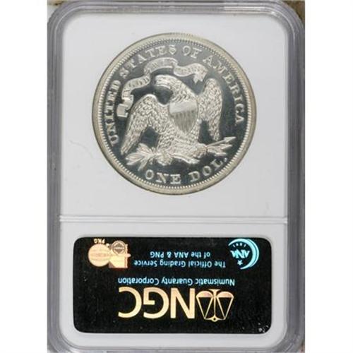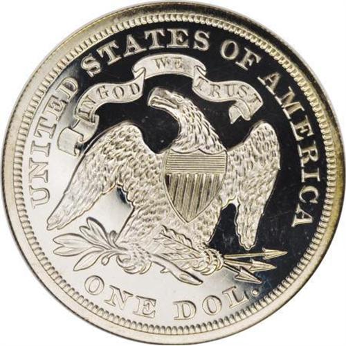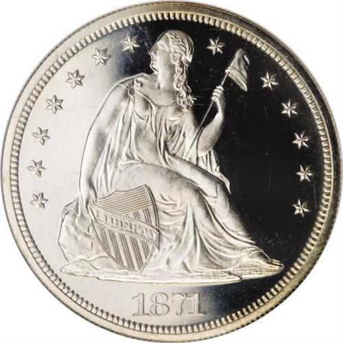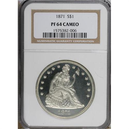 <B>1871 $1 PR64 Cameo NGC.</B></I> The ice-white devices provide obvious contrast with the mirrored fields. The rims have a hint of gold toning, but the fields and motifs are brilliant. The strike is penetrating, even on the eagle's left (facing) ankle. Just 960 proofs were struck. Census: 5 in 64 Cameo, 5 finer (6/07).<BR><BR><b>Shipping:</b> Coins & Currency (<a target="_blank" href="http://www.heritageauctions.com/common/shipping.php">view shipping information</a>)