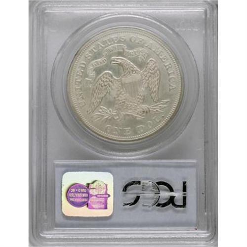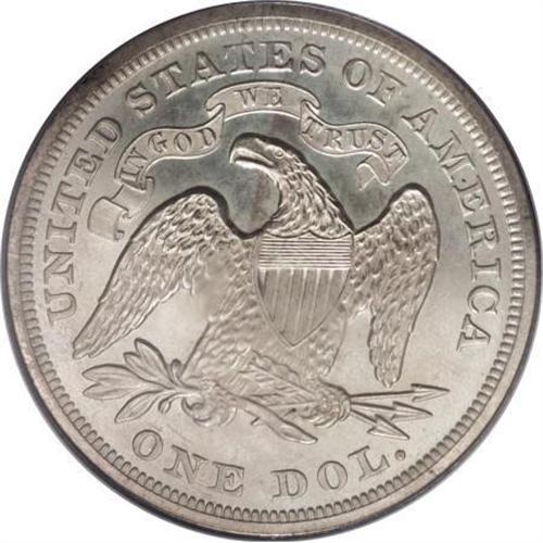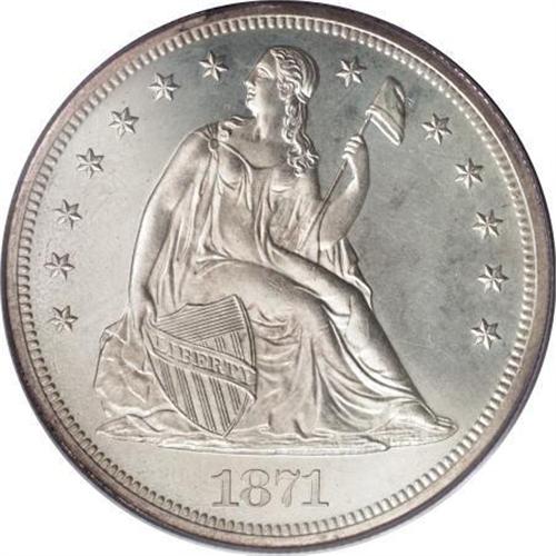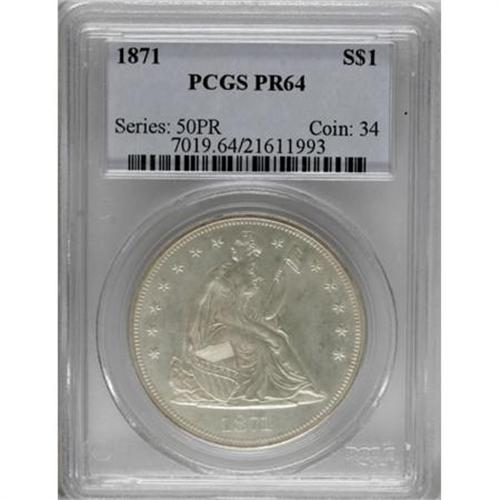 <B>1871 $1 PR64 PCGS.</B></I> Breen-5488. The date is slightly below center, the 71 are spaced apart, and a few die file marks show in the reverse shield at the bottom. Minor doubling shows on the right (facing) wing feathers. This is an attractive piece with just a slight golden cast over the silver surfaces. A few hairlines and scattered contact marks preclude a Gem grade, but the appeal is grand. Population: 42 in 64, 22 finer (7/07).<BR><BR><B>Coin Engraver:</B> Christian Gobrecht<BR><BR><b>Shipping:</b> Coins & Currency (<a target="_blank" href="http://www.heritageauctions.com/common/shipping.php">view shipping information</a>\)