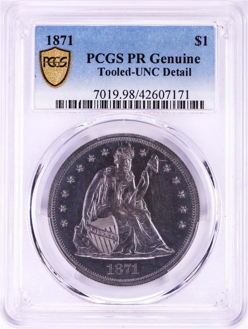 One 1871 $1 Proof Seated Liberty Silver Dollar Coin PCGS Unc Details. PCGS Graded.