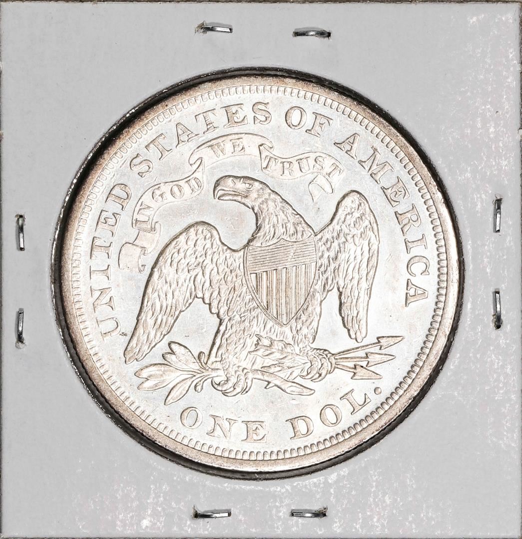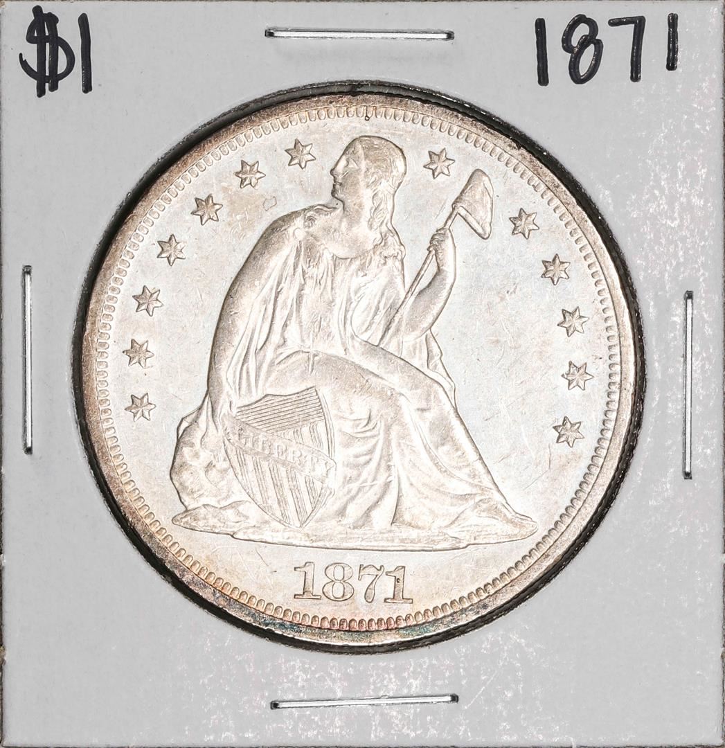 One 1871 $1 Seated Liberty Silver Dollar Coin.