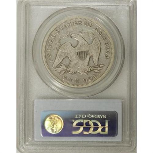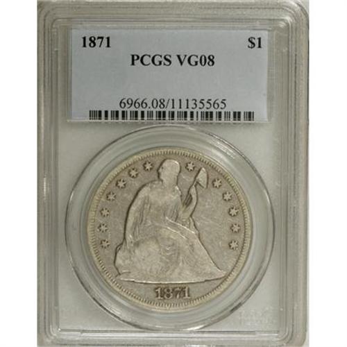 <B>1871 $1 VG8 PCGS.</B></I> PCGS Population (6/511). NGC Census: (1/389). Mintage: 1,074,760. Numismedia Wsl. Price for NGC/PCGS coin in VG8 : $217. (#6966)<BR><BR><B>Coin Engraver:</B> Christian Gobrecht<BR><BR><b>Shipping:</b> Coins & Currency (<a target="_blank" href="http://www.heritageauctions.com/common/shipping.php">view shipping information</a>)