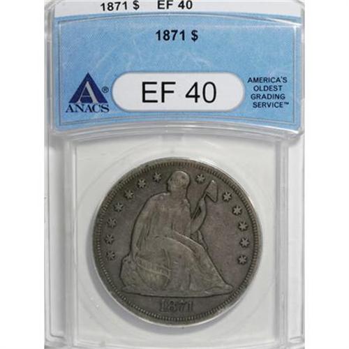 <B>1871 $1 XF40 ANACS.</B></I> NGC Census: (23/335). PCGS Population (42/406). Mintage: 1,074,760. Numismedia Wsl. Price for NGC/PCGS coin in XF40: $400. (#6966)<BR><BR><B>Coin Engraver:</B> Christian Gobrecht<BR><BR><b>Shipping:</b> Coins & Currency (<a target="_blank" href="http://www.heritageauctions.com/common/shipping.php">view shipping information</a>)