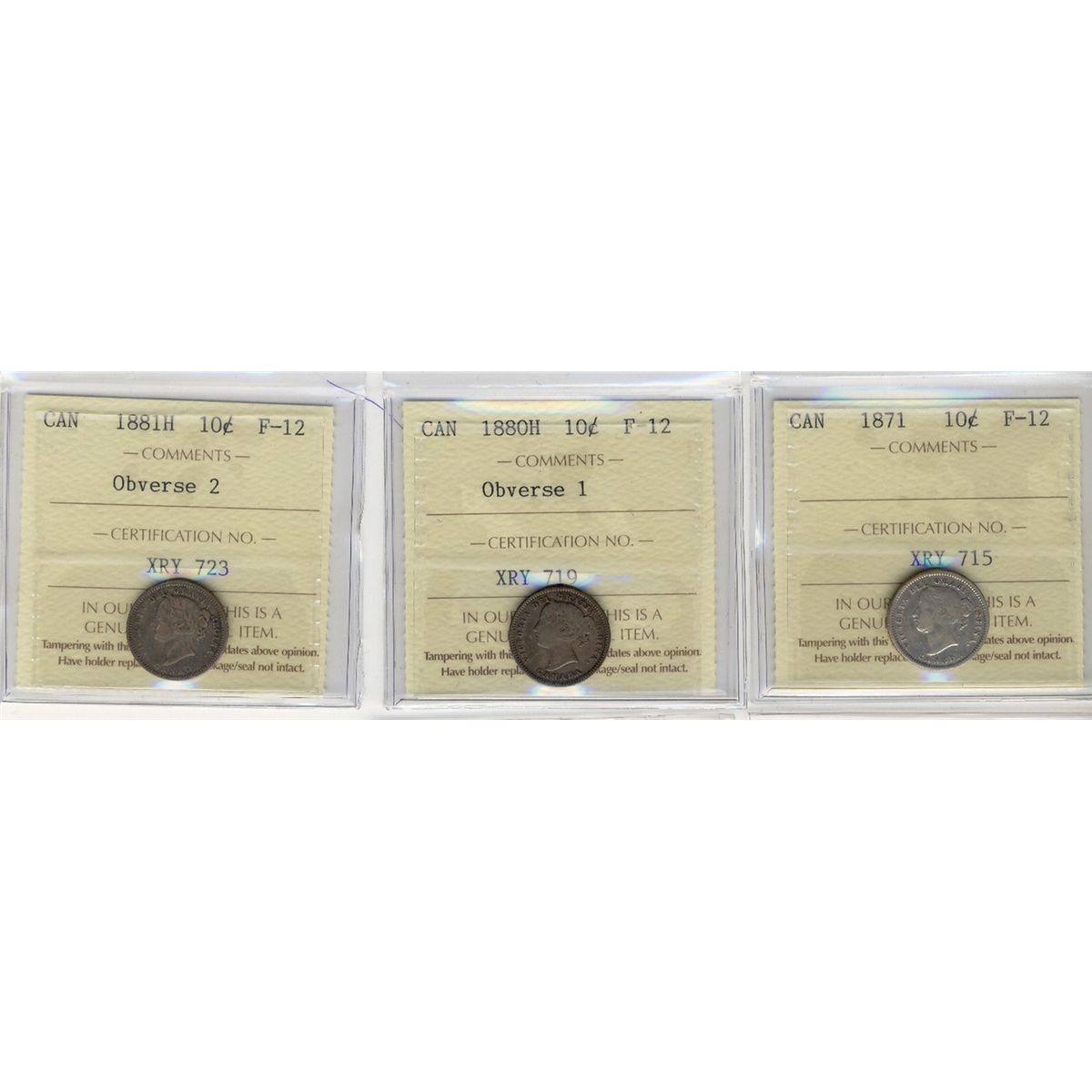 1871 10¢, 1880H & 1881H ICCS F12. Lot of 3 coins.
