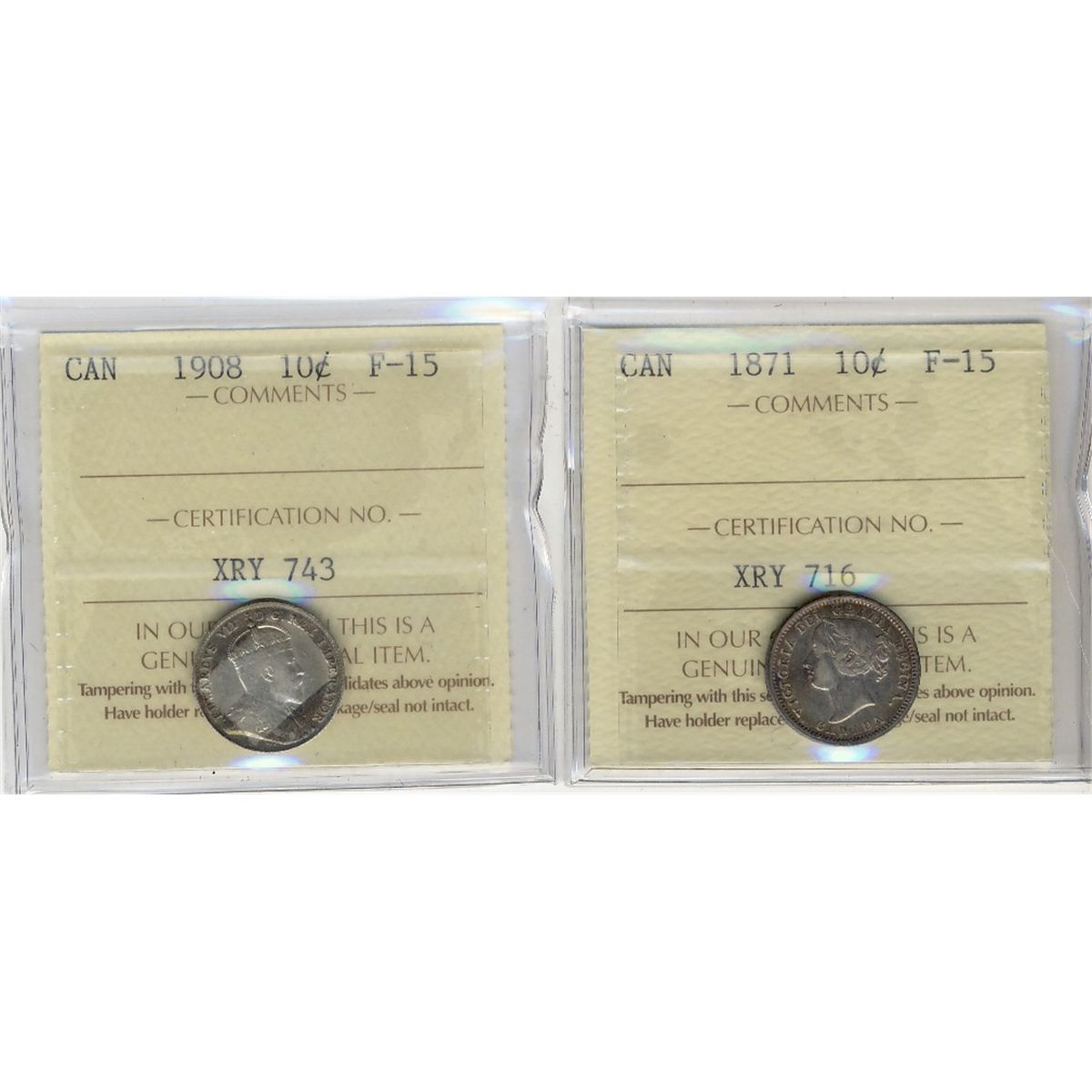 1871 10¢ & 1908 ICCS F15. Lot of 2 coins.