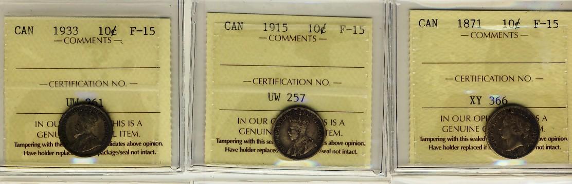 1871 10¢, 1915 & 1933 ICCS F15. Lot of 3 coins