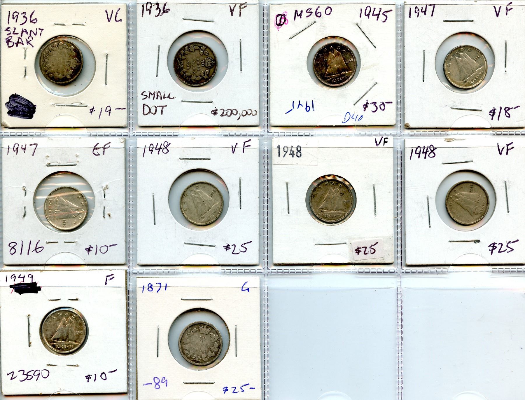 1871 10¢, 1936 (2), 1945, 1947 (2), 1948 (3) & 1949, lot of 10 coins all in average condition.
