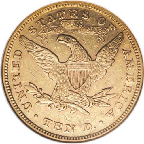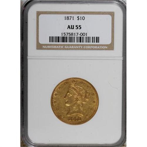 <B>1871 $10 AU55 NGC.</B></I> The 1871 is a formidable sleeper with a mintage of just 1,790 pieces. None of those were set aside by collectors until the 20th century. NGC has certified only 40 pieces in all grades, about one per six months of the firm's existence. A well struck and moderately abraded example with luster about the stars, legends, and devices. Census: 13 in 55, 7 finer (7/07).<BR><BR><B>Coin Engraver:</B> Christian Gobrecht<BR><BR><b>Shipping:</b> Coins & Currency (<a target="_blank" href="http://www.heritageauctions.com/common/shipping.php">view shipping information</a>)