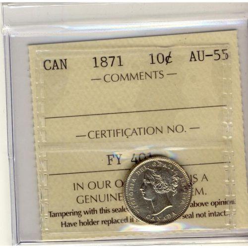 1871 10¢ ICCS AU-55 Lightly toned with lots of luster. Excellent strike with clean fields.