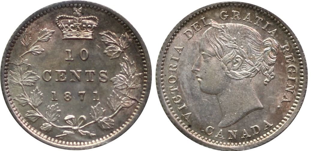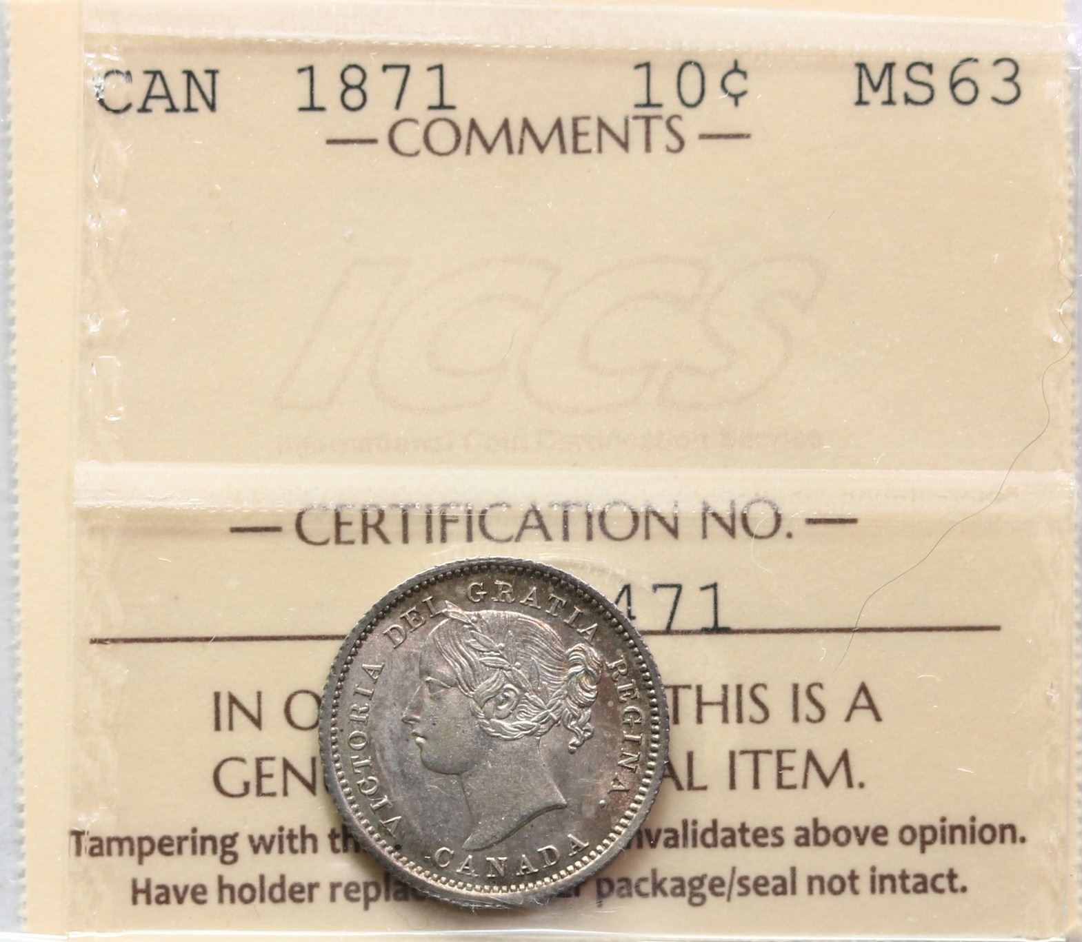 1871 10¢ ICCS Choice Mint State-63 Very light russet tone over full underlying lustre. Seldom offered.