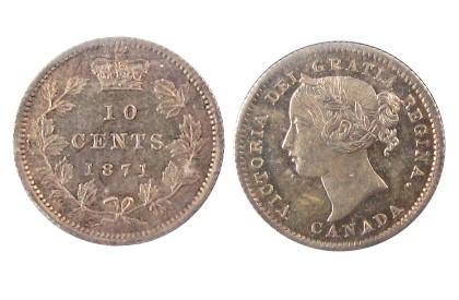 1871 10¢ ICCS MS64. Sharp strike with light tones and frostlike finish on portrait. Tied for Top 2 graded by ICCS standards.
