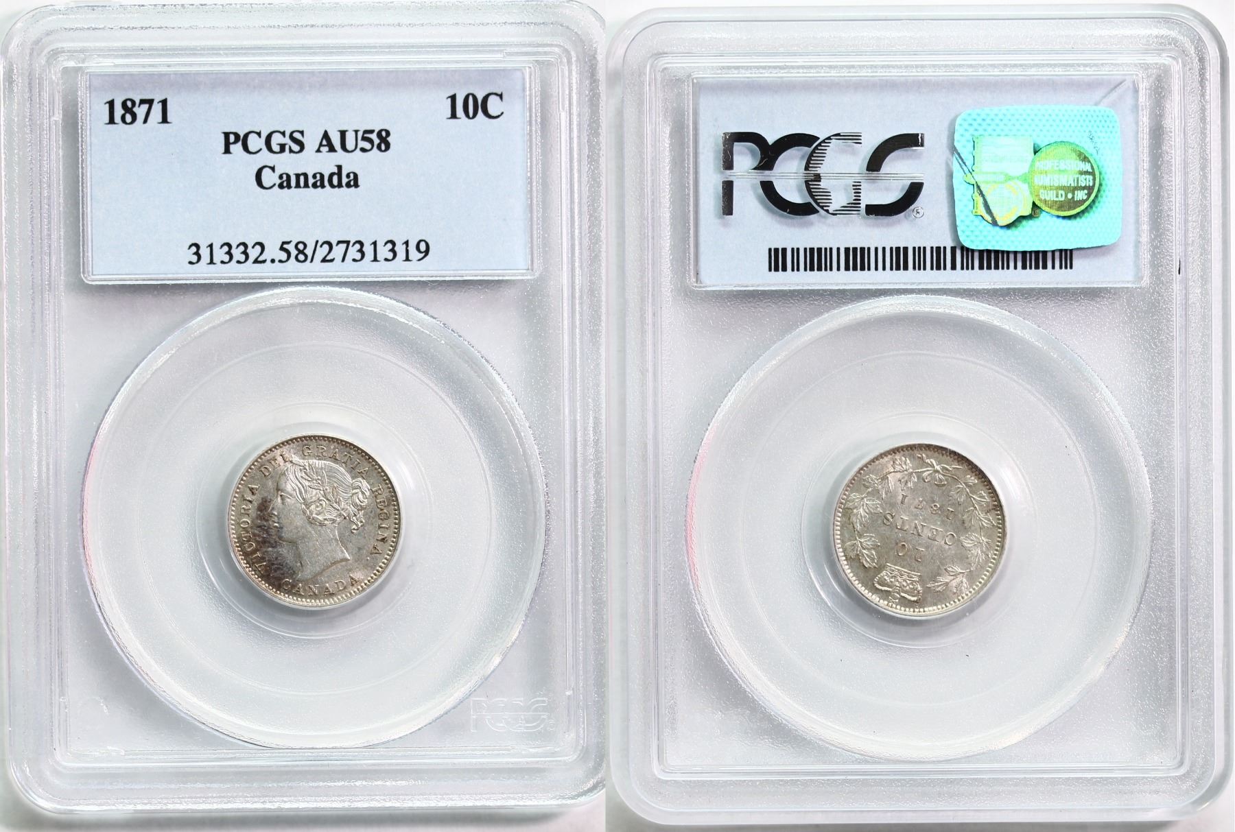 1871 10¢ PCGS Choice About Uncirculated-58 Brilliant and lustrous with a touch of russet tone.