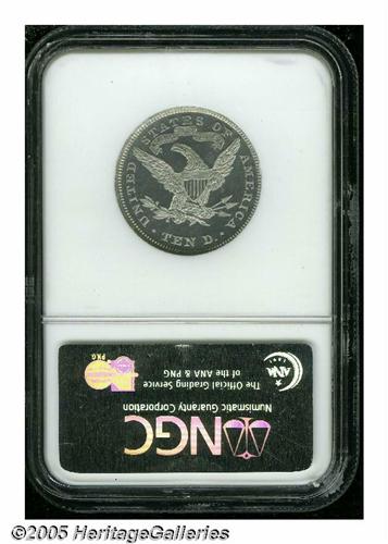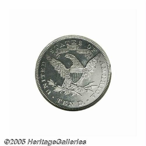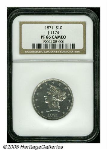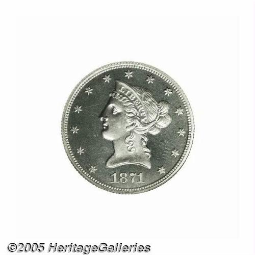 <B>1871<$10> Ten Dollar, Judd-1174, Pollock-1316, R.8, PR66 Cameo NGC.</B></I> A regular die trials piece for the Liberty ten dollar. Struck in aluminum with a reeded edge. All regular issue 1871 denominations are known in aluminum format, these are all either High R.7 or R.8. This suggests a few denomination sets were purposely created, perhaps for presentation purposes, but more likely for sale to wealthy local collectors. The 1994 Pollock reference lists two known pieces; one is the Farouk specimen, which appeared in the famous Sotheby's 1954 "Palace Collection." The other piece was lot 434 in the March 1974 Pine Tree auction, later in the Paramount sale of April 1977 as lot 181. The recent Bowers update of Judd indicates no later auction appearance for Judd-1174. This needle-sharp and essentially immaculate piece exhibits noticeable cameo contrast and has good field reflectivity.
