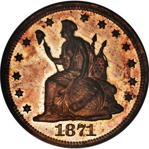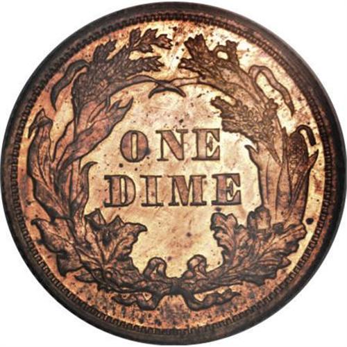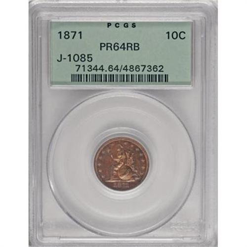 <B>1871 10C Ten Cents, Judd-1085, Pollock-1221, High R.6, PR64 Red and Brown PCGS.</B></I> The regular issue reverse is paired with Longacre's Indian Princess obverse. Struck in copper with a reeded edge. A needle-sharp near-Gem with unabraded surfaces and infrequent obverse carbon. The brick-red appearance approaches full red, although the reverse has slight gray toning along with distributed flecks. Certified in a green label holder.<BR><BR><b>Shipping:</b> Coins & Currency (<a target="_blank" href="http://www.heritageauctions.com/common/shipping.php">view shipping information</a>)