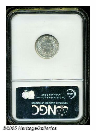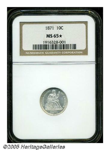 <B>1871<10C> MS65 <S NGC.</B></I> Fortin-102a. A fully brilliant and somewhat prooflike Gem, kept from an even finer grade by a solitary and faint vertical slide mark on the right obverse field. The obverse is lightly die doubled on the tops of the letters in AMERICA, unmentioned in the Fortin reference. The only business strike 1871 Dime to receive a star designation (for superior eye appeal) from NGC.