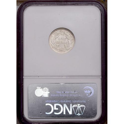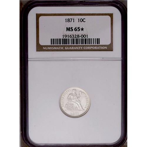 <B>1871<10C> MS65 <img border='0' src='http://www.heritagecoins.com/images/star.gif' width=10 height=10> NGC.</B></I> Fortin-102a. A fully brilliant and somewhat prooflike Gem, kept from an even finer grade by a solitary and faint vertical slide mark on the right obverse field. The obverse is lightly die doubled on the tops of the letters in AMERICA, unmentioned in the Fortin reference. The only business strike 1871 Dime to receive a star designation (for superior eye appeal) from NGC.