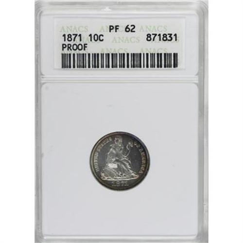 <B>1871 10C PR62 ANACS.</B></I> NGC Census: (9/84). PCGS Population (26/92). Mintage: 960. Numismedia Wsl. Price for NGC/PCGS coin in PR62: $285. (#4764)<BR><BR><B>Coin Engraver:</B> Christian Gobrecht<BR><BR><b>Shipping:</b> Coins & Currency (<a target="_blank" href="http://www.heritageauctions.com/common/shipping.php">view shipping information</a>)