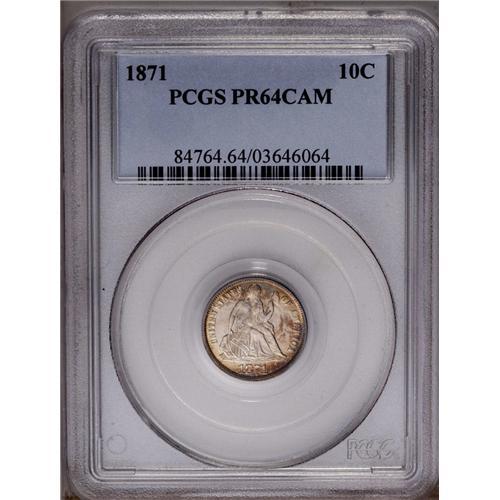 <B>1871<10C> PR64 Cameo PCGS.</B></I> Fortin-101. Golden-brown, apple-green, and cherry-red enrich the borders, while the frosty devices are essentially brilliant. Faint mint-made roller marks are apparent on the obverse. The 18 in the date is repunched north. Just 960 proofs were struck. Population: 4 in 64 Cameo, 4 finer (4/06).