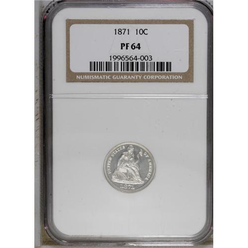 <B>1871<10C> PR64 NGC.</B></I> Light hazy patina appears over the fields of this silver-gray near-Gem. A crisply struck piece that has faint hairlines near the obverse devices. Census: 27 in 64, 33 finer (8/06).