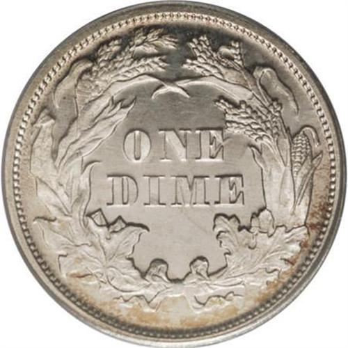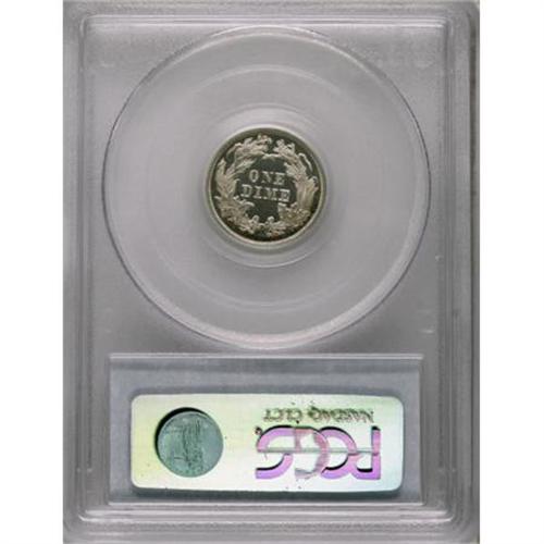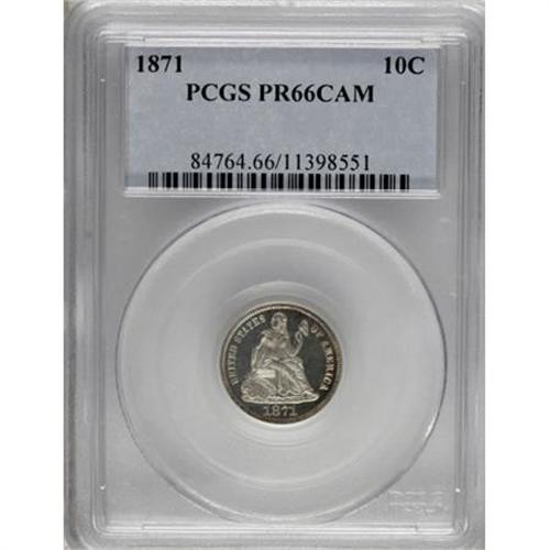 <B>1871 10C PR66 Cameo PCGS.</B></I> This 1871 Premium Gem Cameo is one of 960 proof dimes struck that year. PCGS and NGC have certified around a couple of hundred proof examples, though fewer than 30 have been assigned the Cameo designation. Well impressed, frosted motifs are highlighted by deeply mirrored fields, that display wisps of light cobalt-blue, lavender, and golden-tan peripheral toning. The surfaces are impeccably preserved. Population: 1 in 66 Cameo, 0 finer (7/07).<BR><BR><b>Shipping:</b> Coins & Currency (<a target="_blank" href="http://www.heritageauctions.com/common/shipping.php">view shipping information</a>\)