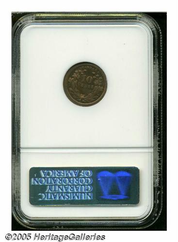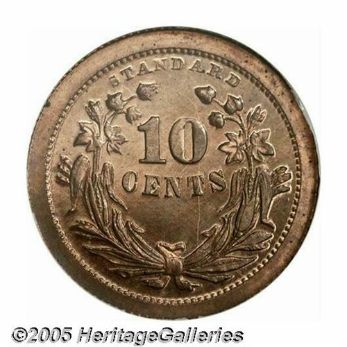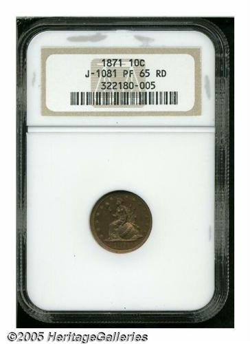 <B>1871<10C> Standard Silver Ten Cents, Judd-1081, Pollock-1217, R.7, PR65 Red NGC.</B></I> The Longacre Seated Liberty design on the obverse is paired with a reverse that features 10 CENTS in the center, surrounded by a wreath of cotton and corn, and the word STANDARD at the top of the reverse. Struck in copper with a reeded edge. Just a few trivial flyspecks are noted over beautiful sunset-orange surfaces.<BR><I>From The Western Hills Collection.</B></I>