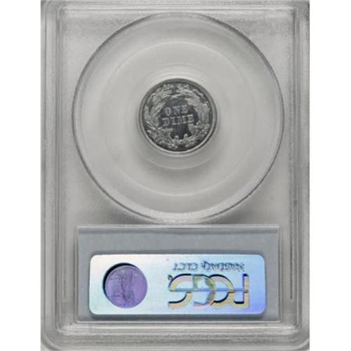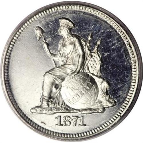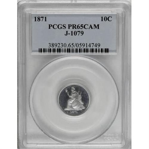 <B>1871 10C Ten Cents, Judd-1079, Pollock-1215, High R.7, PR65 Cameo PCGS.</B></I> A figure of Liberty is seated and facing left with 1871 below. She is wearing an Indian headdress and is supporting a liberty pole with her right hand. Her left hand rests on a globe inscribed LIBERTY. The reverse is the same design used on production issues. Struck in aluminum with a reeded edge. <BR> Saul Teichman states that three pieces are known, and the pedigrees of each of these were listed in our FUN auction from 2007. Saul also states that a fourth piece may exist and it might be from the legendary Farouk Sale (1954). While this piece is the same grade as the Bass coin that we sold in July 2003, the pedigree markers are different on the two coins. This may, indeed, be the Farouk specimen. <BR> The surfaces are brilliant throughout with the bright, gleaming reflectivity that is so appealing on proof aluminum patterns. The same peripheral die cracks are present on this piece as on the Bass coin. On this example, the central design motifs are exceptionally frosted and present a stark cameo contrast against the deeply mirrored fields. A magnificent pattern. The lack of peripheral obverse stars gives this piece a medal-like appearance that adds greatly to its overall appearance.<BR><BR><b>Shipping:</b> Coins & Currency (<a target="_blank" href="http://www.heritageauctions.com/common/shipping.php">view shipping information</a>)