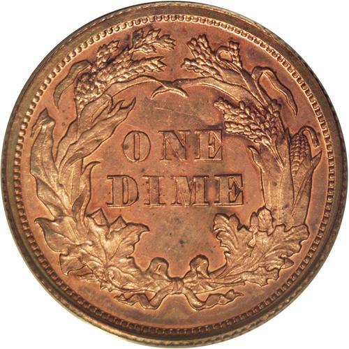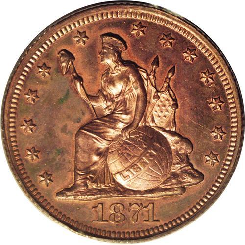 <B>1871<10C> Ten Cents, Judd-1085, Pollock-1221, R.7, PR64 Red and Brown PCGS.</B></I> The Longacre-derived obverse features Liberty seated wearing an Indian headdress with left hand resting on a globe, right hand holding a pole with cap on top, and conjoined flags behind. The reverse is from the regular issue Seated dime dies. Struck in copper with a reeded edge. Probably over a half dozen examples are known today of this interesting pattern. A significant amount of original red still remains with the fields taking on a deeper hue of brown for a pleasing two-toned effect. Fully struck in all areas. <BR><BR><B>Important notice:</B> Heritage usually auctions material at the rate of 200-250 lots per hour. On some occasions eBay Live bid software or the Internet may not be able to keep up with the pace of the auction. We recommend placing a realistic absentee bid now as insurance to avoid disappointment. Occasionally the auctioneer may eliminate or reject an eBay Live bid, and the auctioneer may also reopen a lot after the close of the eBay live bidding (usually because we missed an audience bid), and may reject your bid even if it shows you as the winning bidder. By bidding via eBay Live, you agree that Heritage may award the lot to another bidder at its sole discretion under the circumstances described above or any other reasonable circumstances. Since eBay bids are not shown to us until we open the lot on the floor, we treat those bids just like floor bids. In most cases the floor responds before the eBay bid is presented to us, due to Internet lag time, so for consistency we have made it a policy that floor bids are always considered first over tie eBay live bids. Also please note that all Heritage lots purchased through eBay Live carry a 20% Buyer's Premium. Please make sure you read the Terms and Conditions before you bid. This lot is being auctioned in conjunction with a live floor auction by Heritage Galleries & Auctioneers. All final auction and invoice information will be supplied by Heritage Galleries & Auctioneers, and all other information should be considered preliminary. Lot:1851 <BR><BR><B>Winning Notification and Billing:</B> After the FINAL session in this auction is complete, Heritage will send e-mail and snail mail invoices. This process normally takes several days. All final auction and invoice information will be supplied by Heritage Galleries & Auctioneers, and all other information should be considered preliminary. <BR><BR>This auction will be conducted on a live auction floor and over the Internet through eBay Live. If you choose to place an absentee bid, please take a moment to <font color='#0000ff'><u><a href='http://pages.ebay.com/liveauctions/help/before/laabsentee.html'>learn how eBay Live absentee bidding works</a></u></font><font color='#000000'>
