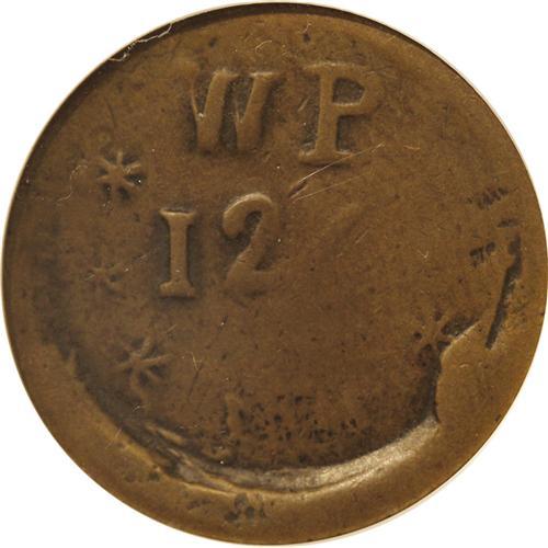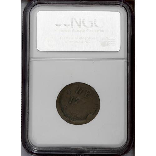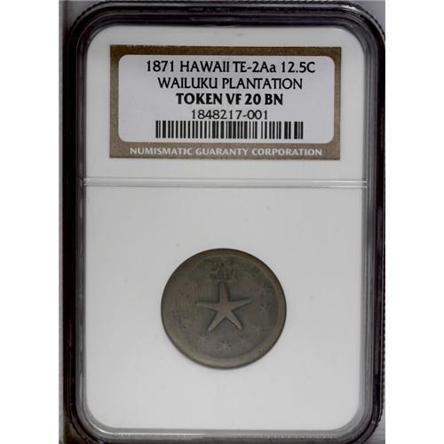 <B>1871<12.5C> Wailuku Plantation Token VF20 NGC.</B></I> Medcalf 2Aa. A heavily worn, and doubtless much-used, token that retains rich chocolate-brown patina with darker color surrounding some of the devices. A large die cud appears on the lower right of the reverse rim. These tokens were redeemable at the plantation store on Maui.