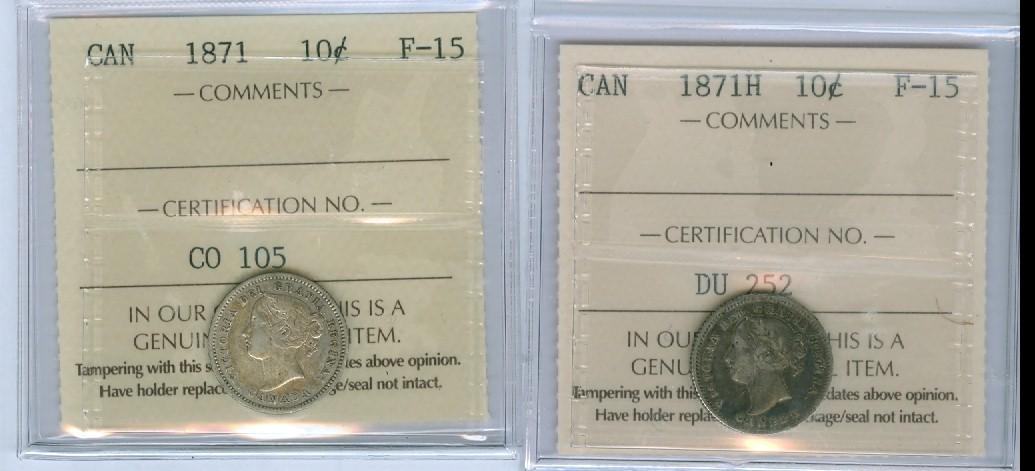 1871 & 1871H 10¢ ICCS F15. Lot of two coins.