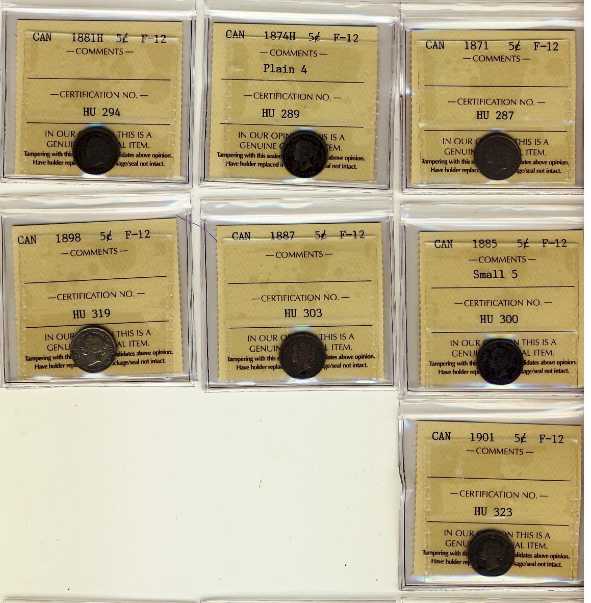 1871, 1874H Pln, 1881H, 1885 Sml 5, 1887, 1898 & 1901 5¢ ICCS F12. Lot of 7 coins.