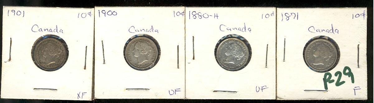 1871, 1880H, 1900, 1901, Grades vary from F12 to VF20. Lot of 4 10¢ pieces.
