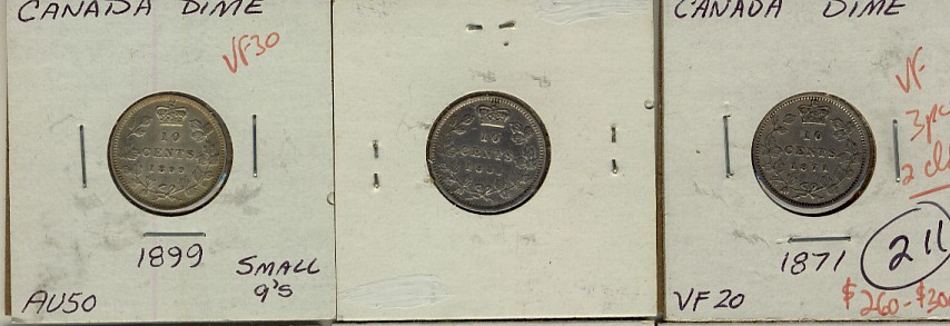 1871, 1888, 1899 Sm9's 10¢, all 3 pieces VF but two are cleaned.