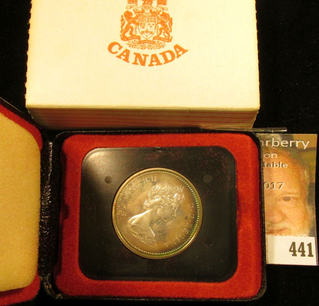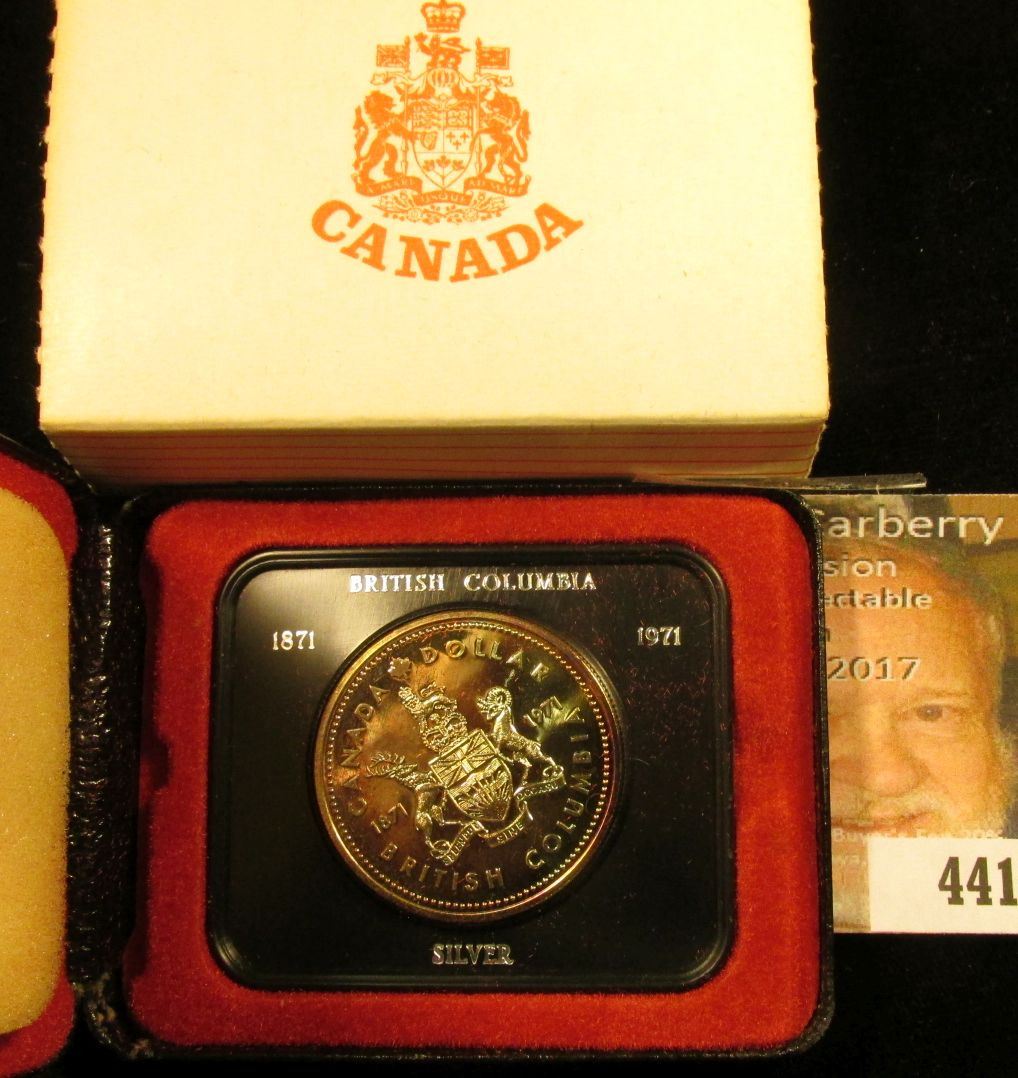 1871-1971 British Columbia encased .500 Fine Silver Dollar in original box of issue. Prooflike.